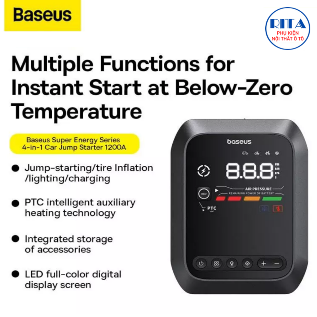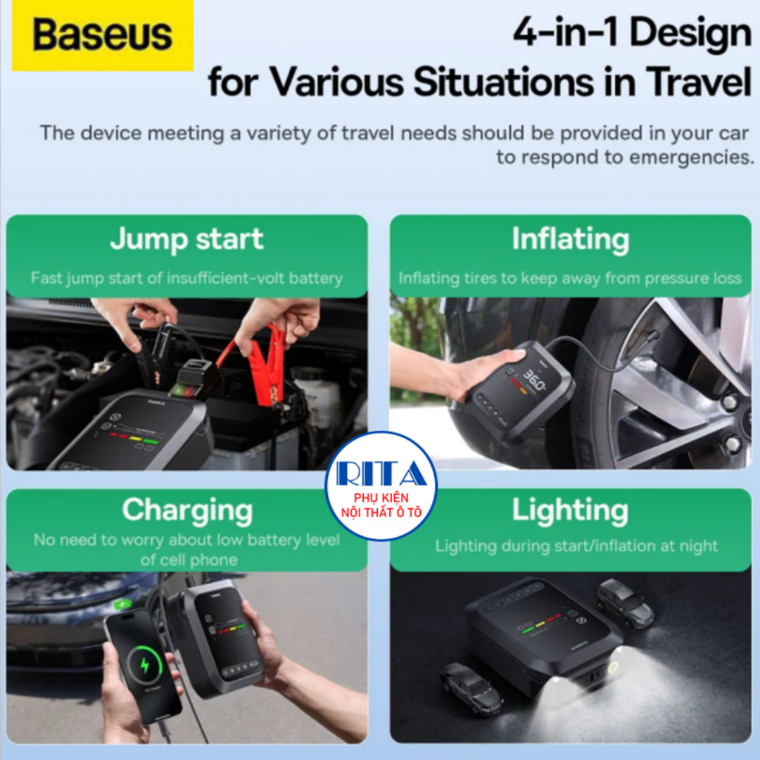 Baseus Jump Starter 1200A là Bơm lốp đa năng với 4 chức năng tiện lợi tích hợp trong một thiết bị nhỏ gọn tiện lợi mang theo xe. Giúp tài xế luôn chủ động dự phòng với các sự việc bất ngờ với bình xe và lốp xe của mình.